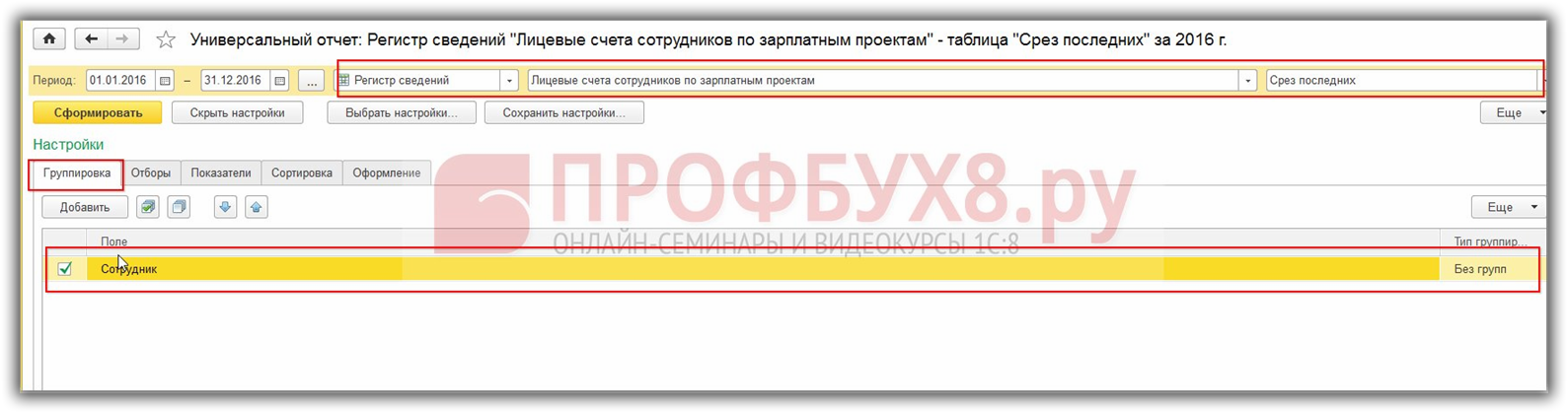 Сформируем Универсальный отчет по одноименному регистру сведений, сделав следующие настройки: