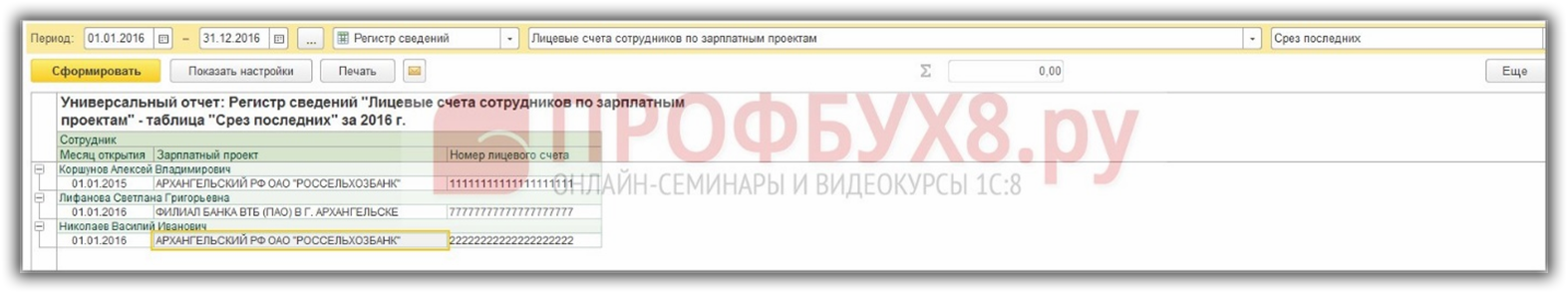 Например, необходимо в 1С 8.3 найти информацию по сотрудникам, у которых уже открыты лицевые счета в банках для перечисления заработной платы.