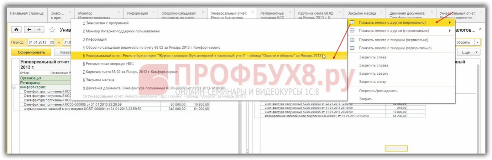 Можно расположить окна с отчетами рядом для удобства сравнения данных: