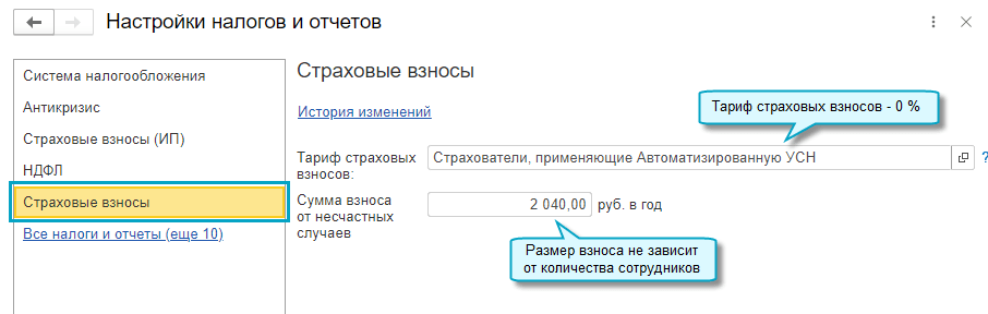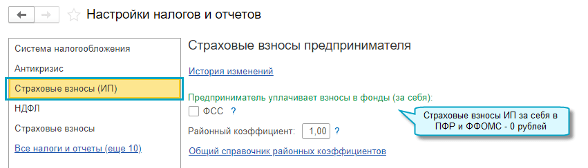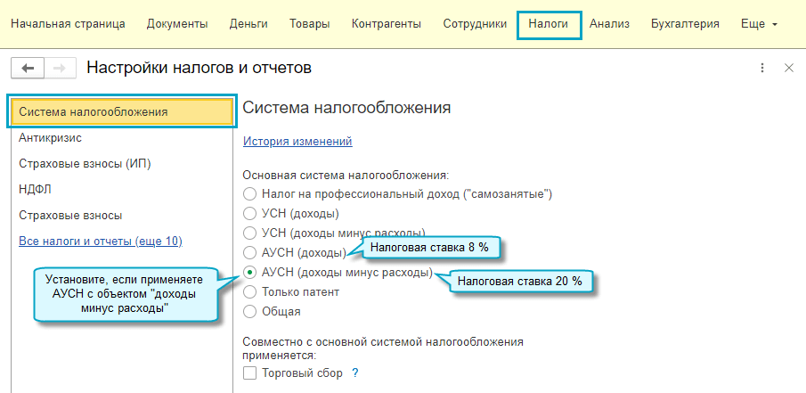 Простой интерфейс: меню «Налоги — Настройка налогов и отчетов».