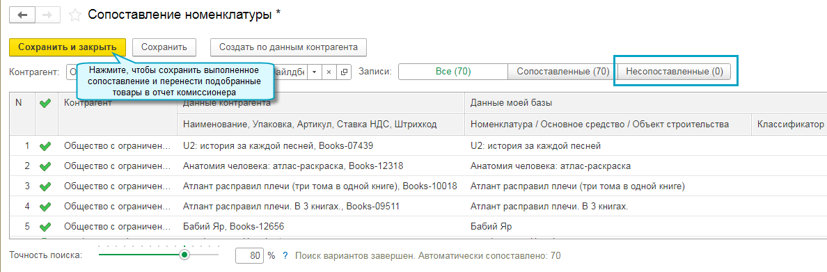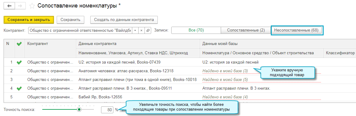 Если потребуется, выполните сопоставление номенклатуры, аналогично описанной выше загрузке из личного кабинета Wildberries.