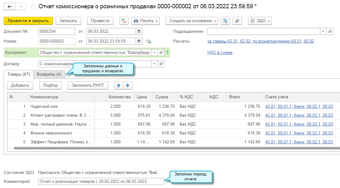 При выборе конкретной записи можно посмотреть более детально продажу и возвратов. Отчеты предназначены для анализа продажи , а также для создания документа отчета комиссионера и документа приобретения услуг ( накладная прихода) .