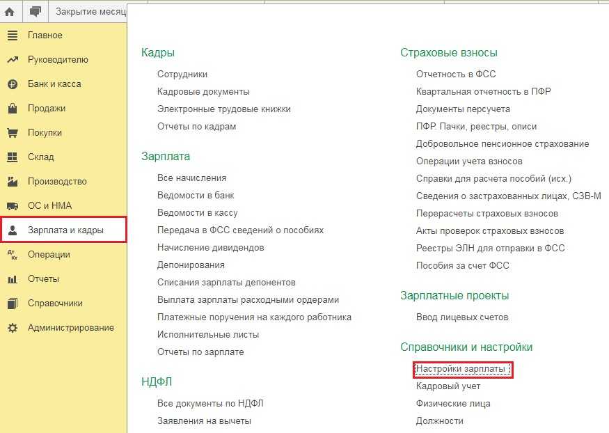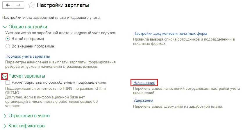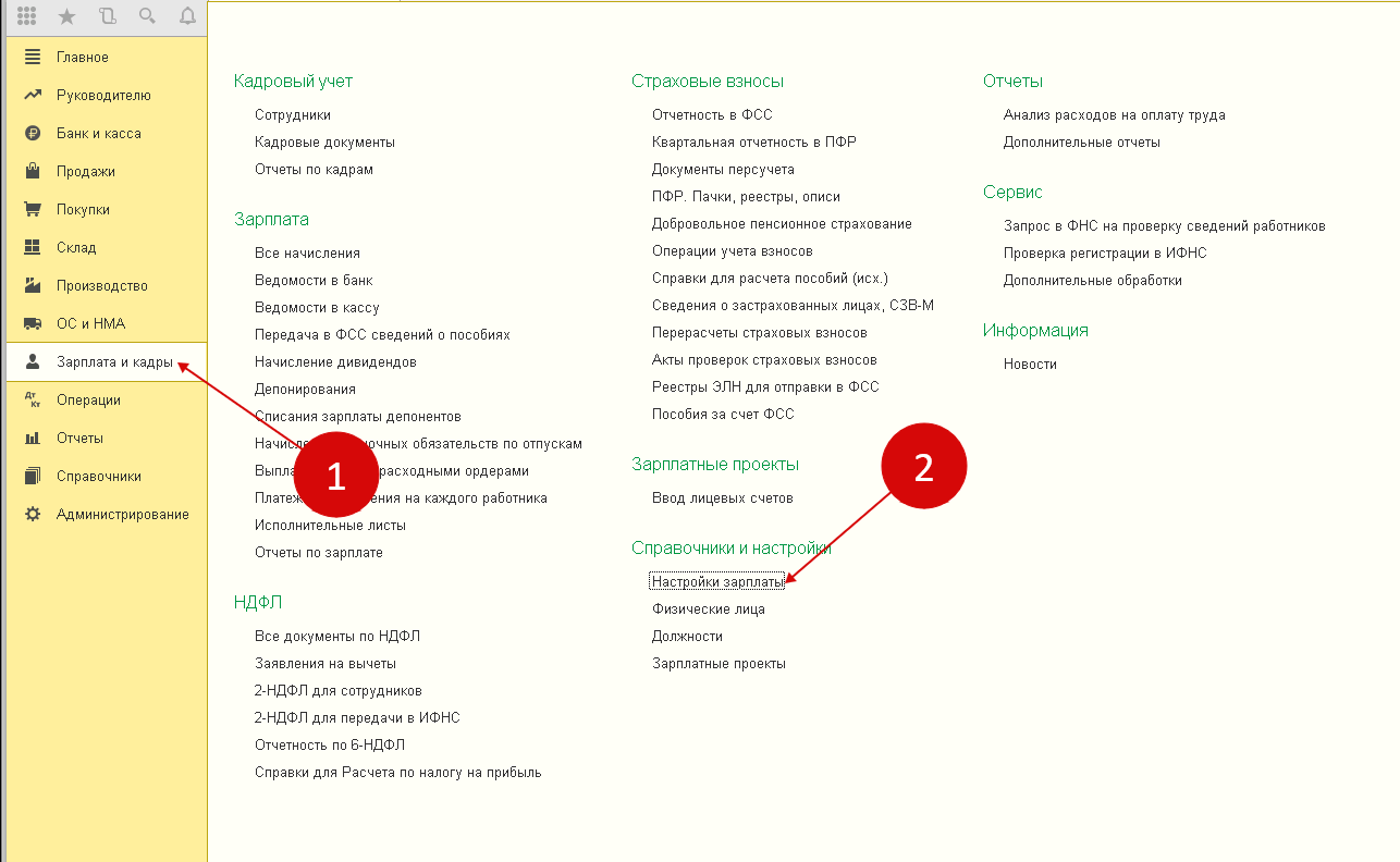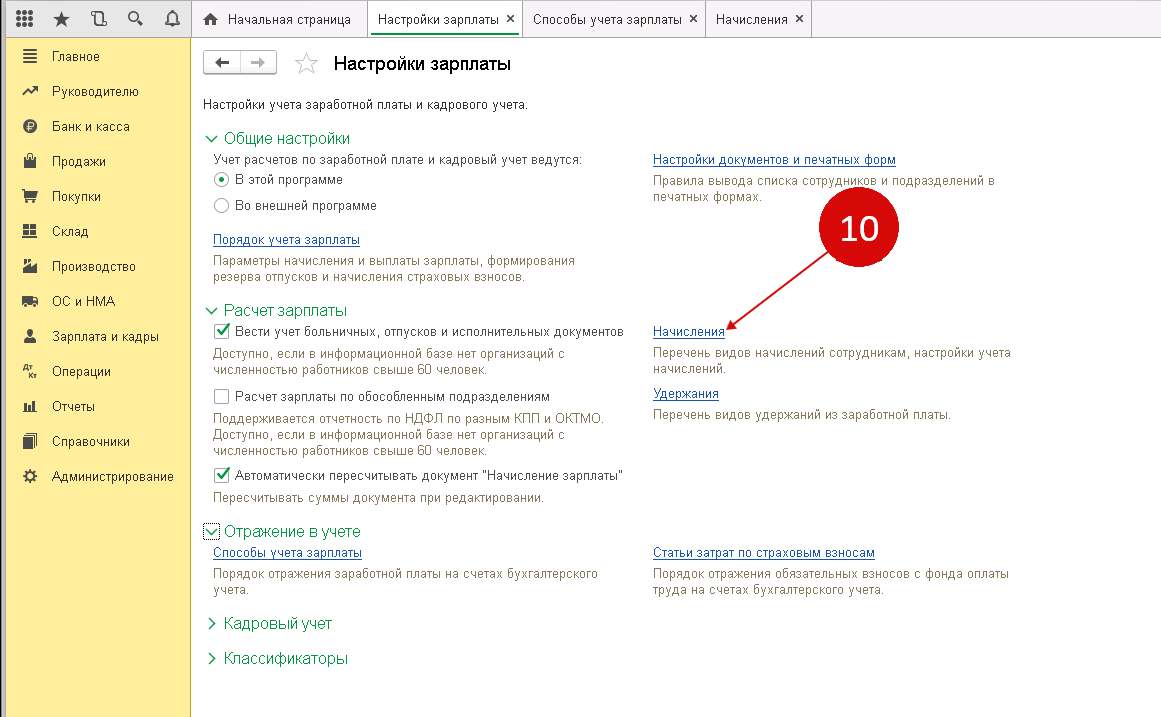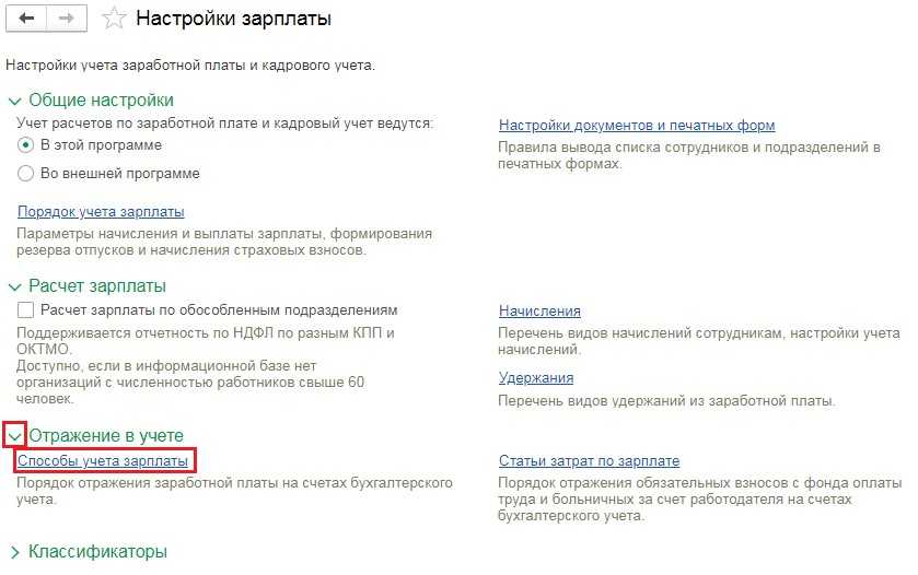 Первый справочник, который за это отвечает, находится в разделе «Зарплата и кадры» и называется «Способы учёта зарплаты». Открыть его можно из пункта «Настройки зарплаты».