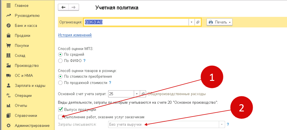 Если у вас в учетной политике стоит галочка напротив надписи «Выполнение работ, оказание услуг заказчикам» (1) и ниже указано «Без учета выручки» (2), то счет 20 будет закрываться независимо от того, был выпуск продукции или нет