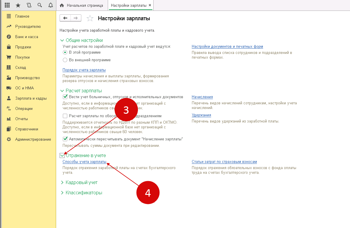 В окне настроек зайдите в раздел «Отражение в учете» (3) и кликните на ссылку «Способы учета зарплаты» (4). Откроется окно «Способы учета зарплаты».