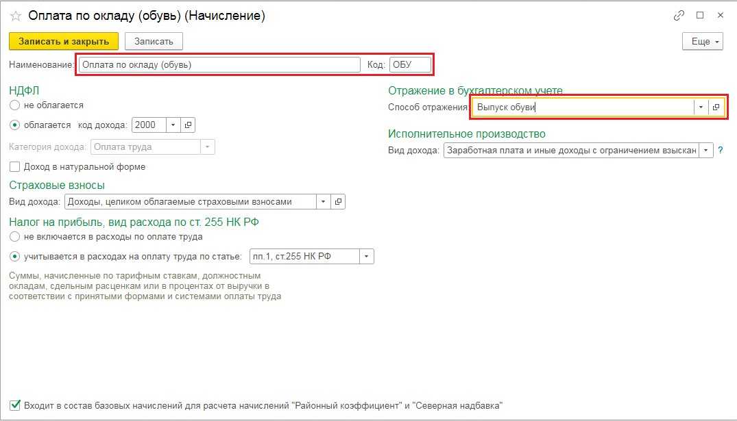 Если у вас есть разделение сотрудников по конкретному типу продукции, например, есть закройщик, отвечающий за определённые туфли, то данный вид продукции также можно указать в способе учёта зарплаты, как на рисунке ниже.