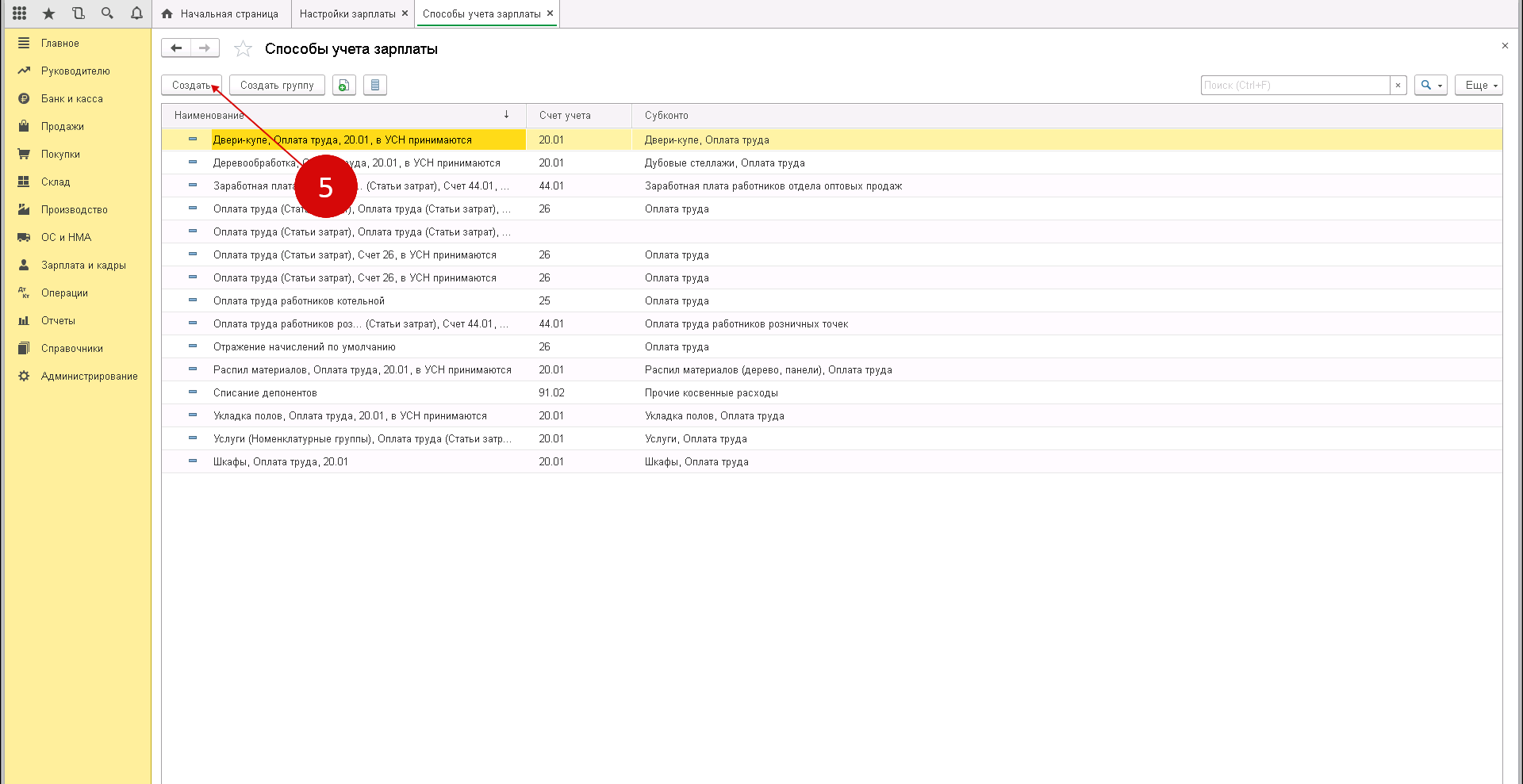 В открывшемся окне вы видите список всех ранее созданных способов начислений заработной платы. Как создать новый способ, например для начисления зарплаты работникам, занятых на производстве шкафов? Для этого нажмите кнопку «Создать» (5).