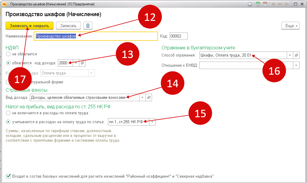 Здесь укажите наименование нового начисления (12), признак обложения НДФЛ (13), выберете признак обложения страховыми взносами (14), вид расхода для налогообложения (15). В «Способе отражения» (16) укажите созданный способ отражения зарплаты. Чтоб сохранить значение, нажмите кнопку «Записать и закрыть» (17). Для каждой номенклатурной группы надо создать свой вид начисления и использовать его для отражения зарплаты производственных рабочих. Если был выпуск продукции по номенклатурным группам «Столы» и «Шкафы», то начисление зарплаты тоже нужно формировать по этим номенклатурным группам. Если сделать начисление оплаты труда по другой номенклатурной группе, то счет 20 не закроется.