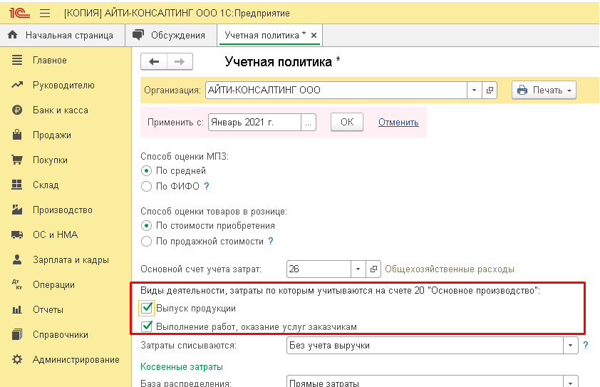 У каждой компании могут быть свои правила учетной политики, и поэтому в программном обеспечении каждый год создаются необходимые параметры и справочники. По ним на протяжении всего года рассчитываются прямые расходы, а также определяются косвенные затраты.