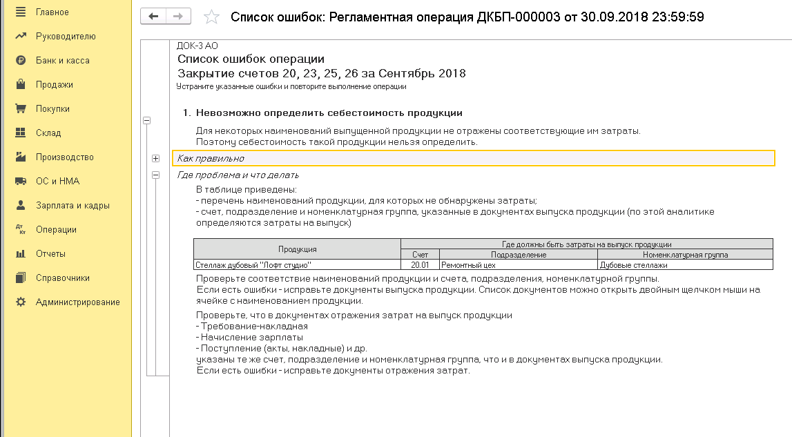 Другими словами, если вы в требовании-накладной при передаче материалов в производство указали подразделение «Мебельный цех» и номенклатурную группу «Шкафы», то при выпуске продукции из этих материалов также укажите подразделение «Мебельный цех» и номенклатурную группу «Шкафы». В противном случае при закрытии месяца в 1С 8.3 может произойти ошибка. При этом на экране появится такое сообщение: