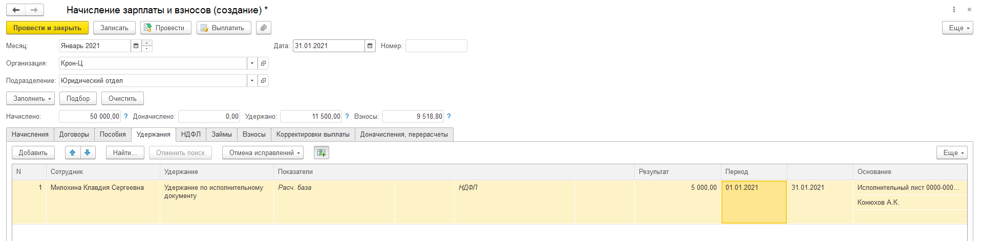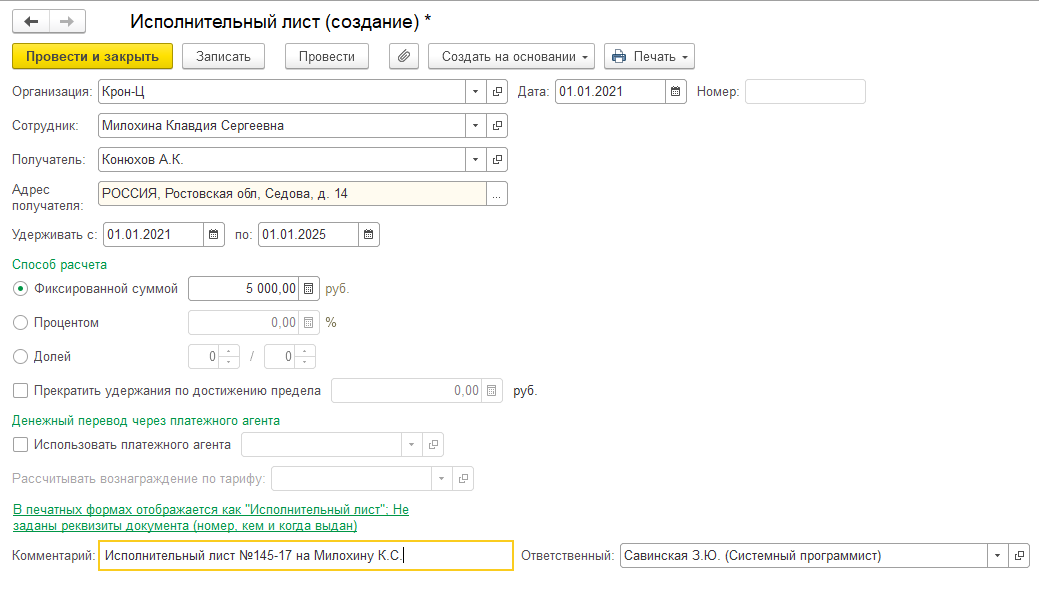 01.01.2021 организация получила от судебных приставов постановление: надо удержать с сотрудницы Милохиной К.С. по исполнительному листу в пользу Конюхова А.К. Получатель проживает в Ростове-на-Дону, ул. Седова, дом 14. Сумма удержания – фиксированная, 5000 руб. Период удержаний – с 01.01.2021 по 01.01.2025.