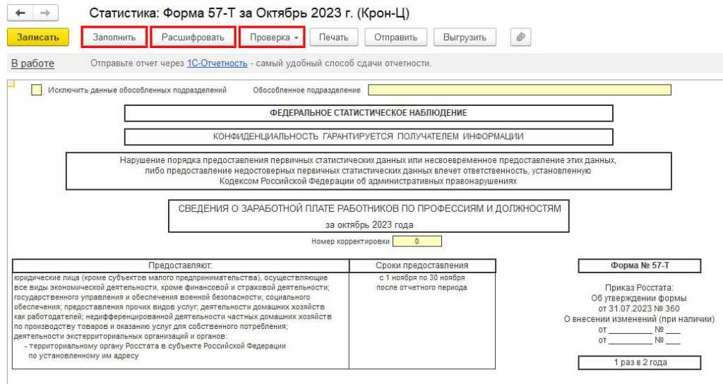 Отчет Статистика: Форма 57-Т за Октябрь 2023 года заполнится автоматически по кнопке Заполнить