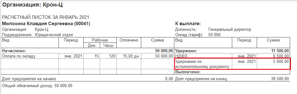 На закладке «Удержания» мы можем увидеть сумму, которую удержали с Милохиной К.С. документом «Исполнительный лист». То же увидим, сформировав расчетный листок по сотруднику (раздел «Зарплата» – ссылка «Отчеты по зарплате» – ссылка «Расчетный листок»).