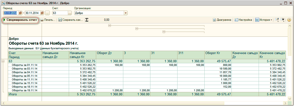 После выполнения всех настроек необходимо нажать на кнопку «Сформировать отчет» в левой верхней части окна отчета «Обороты счета».
