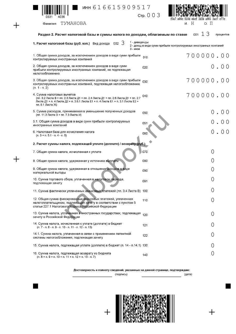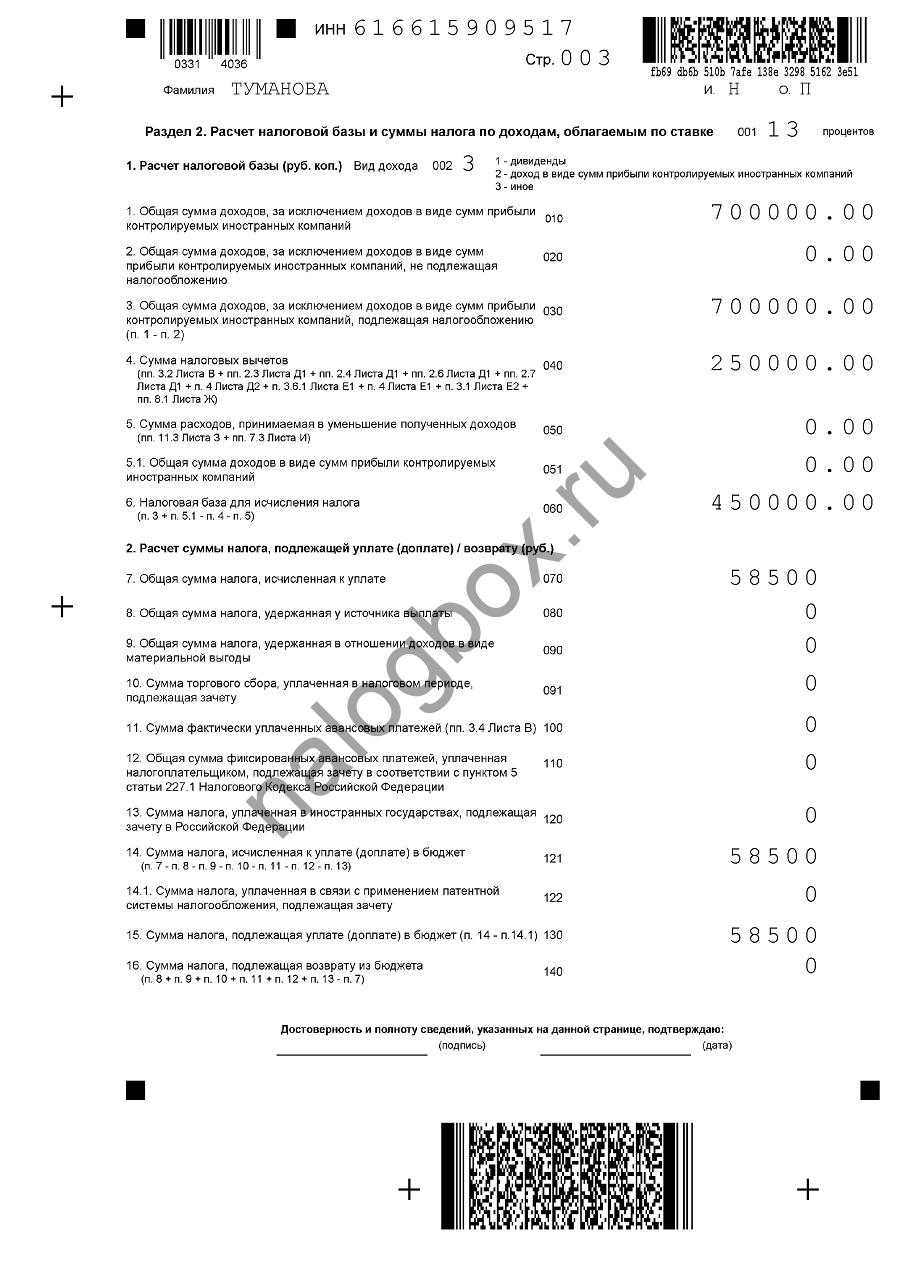 010 – общая сумма дохода из поля 080 листа А. 030 – совпадает с суммой, указанной в поле 010 этого раздела. 040 – сумма вычета, переносится из поля 190 листа Е. 050 – налоговая база, получается как разность строк 030 и 040.