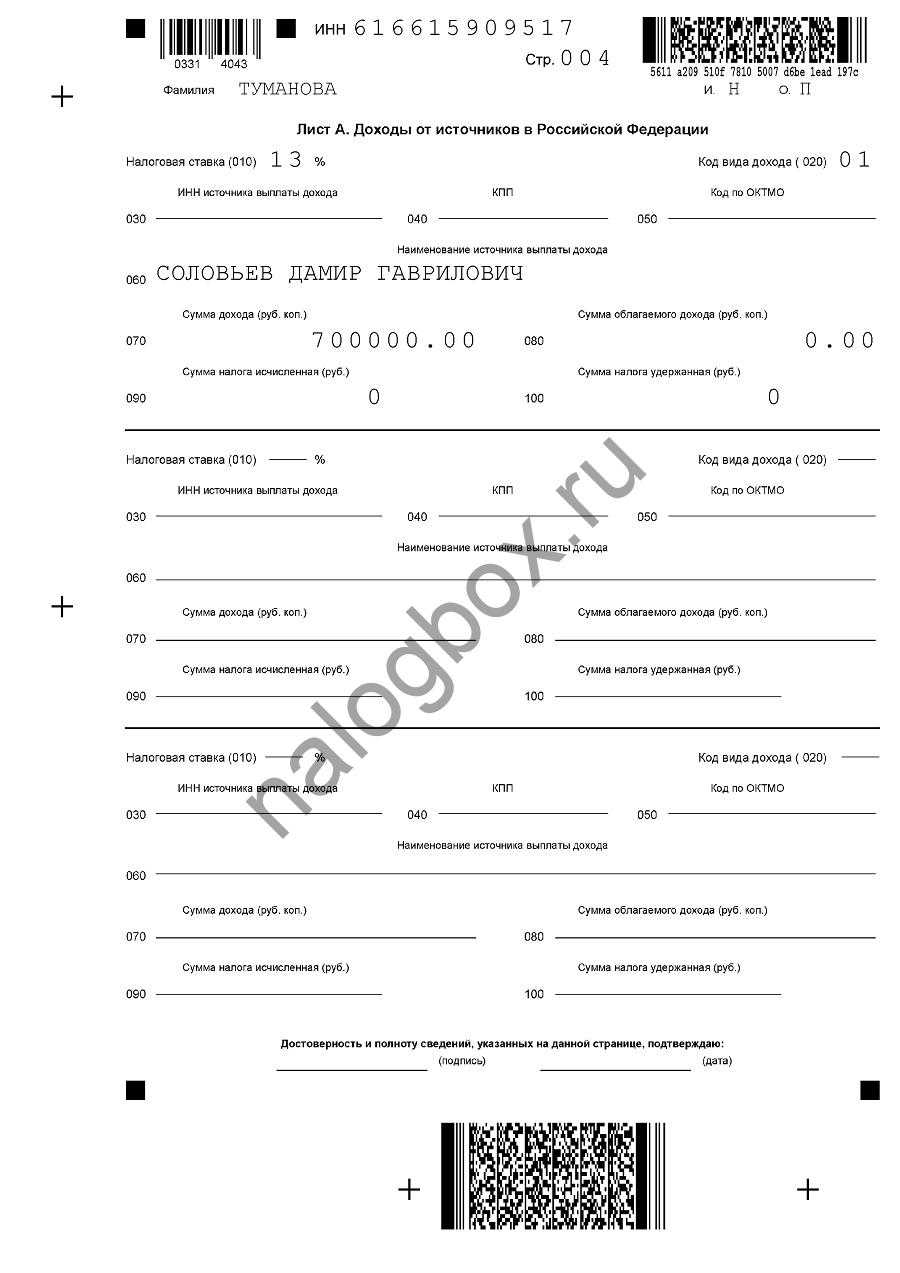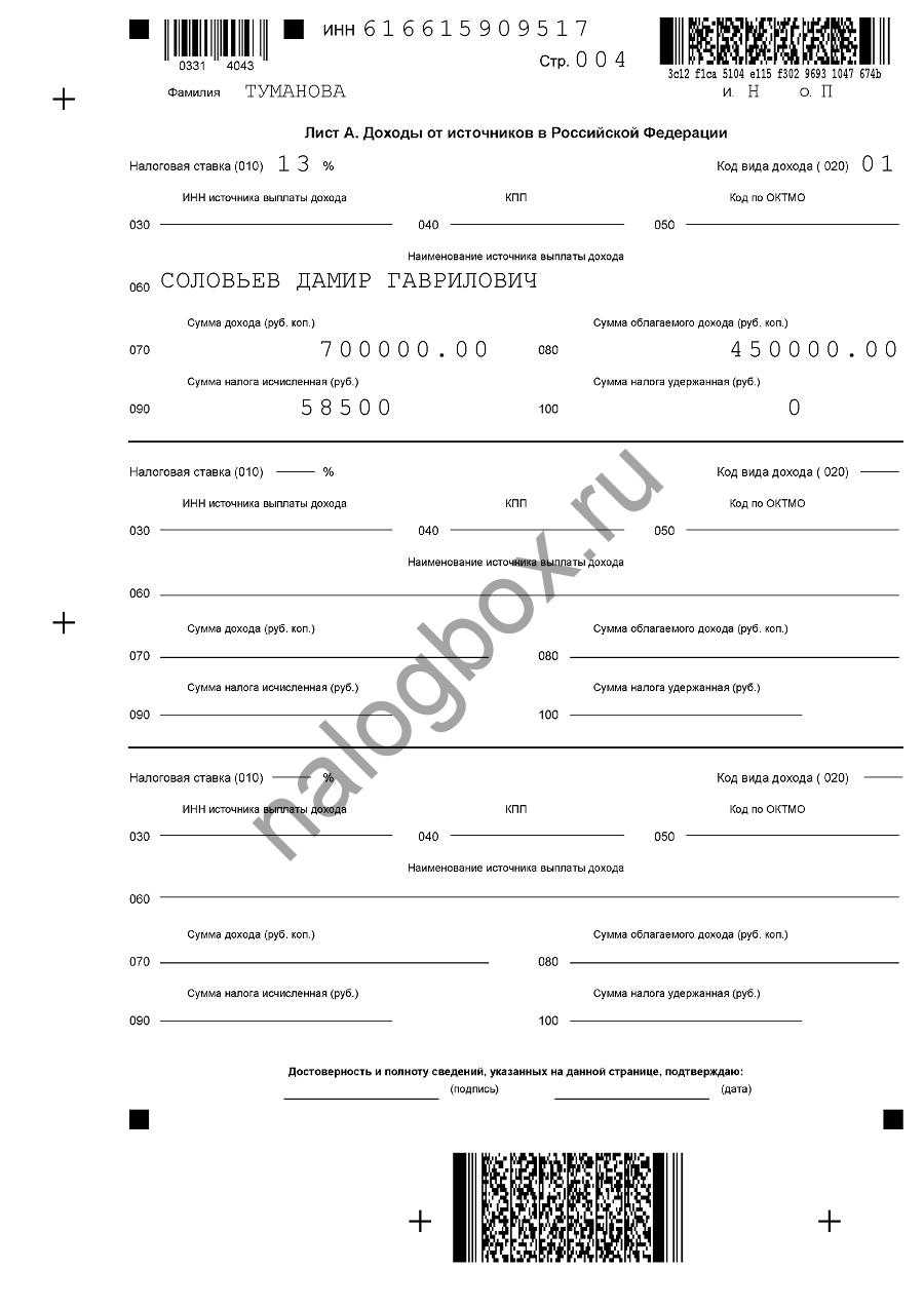 Образец 3-НДФЛ при продаже квартиры более 3 лет в 2018 году