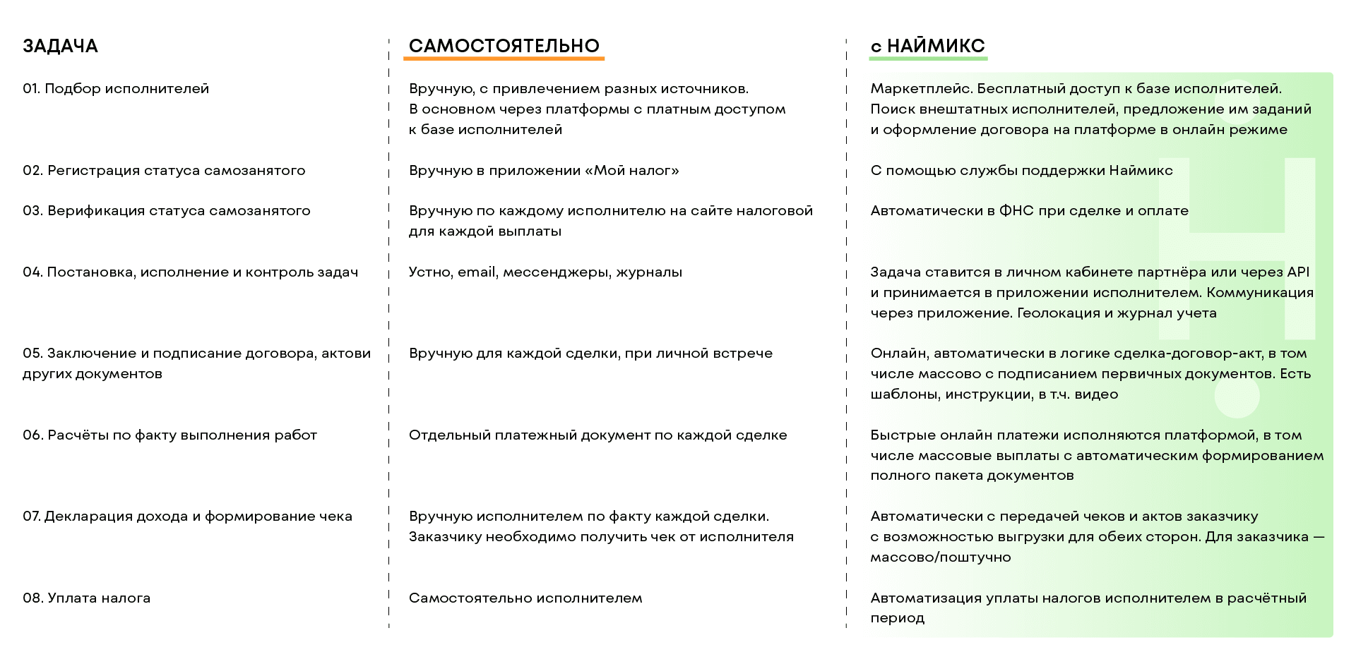 Резюмируя, решение «Наймикс» — это гибкий инструмент автоматизации и администрирования, который подстраивается под нужды бизнеса из разных отраслей. Платформа обеспечивает прозрачную, удобную и легитимную работу по всем правилам с самозанятыми исполнителями, включая специалистов на аутсорсе без расчетов наличкой.