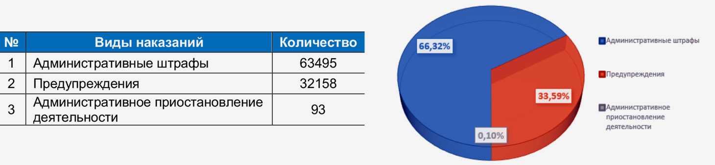 Структура общего количества наложенных в 2018 году административных наказаний по результатам проверок по видам выглядит следующим образом: