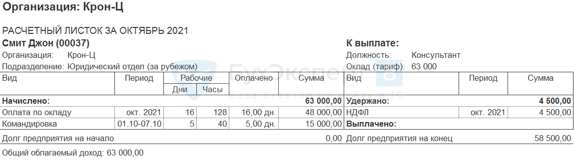 Для проверки формируем Расчетный листок (Зарплата – Отчеты по зарплате) сотрудника. Общая сумма начислений работника составила 63 000 руб. (48 000 оклад + 15 000 командировка), но НДФЛ был рассчитан верно – только с оплаты командировки (4 500 руб.)