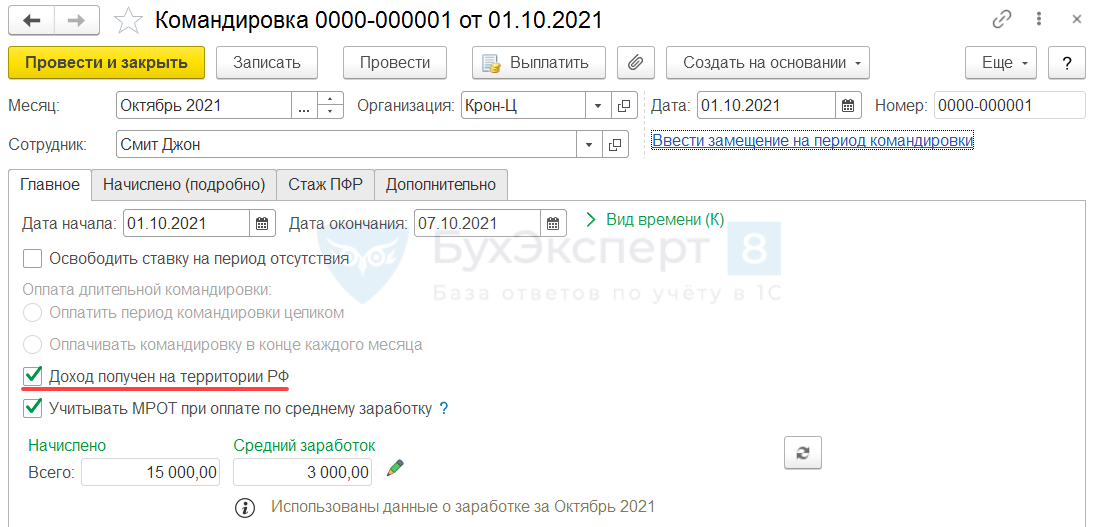 Чтобы с оплаты командировки на территории РФ рассчитался НДФЛ, в документе Командировка установим флажок Доход получен на территории РФ.