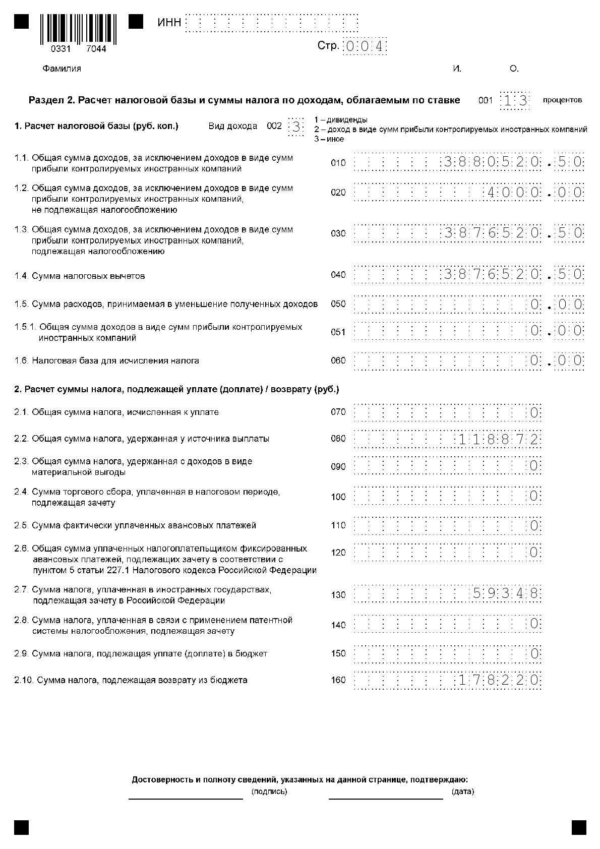 Теперь нужно указать общую сумму удержанного налога.