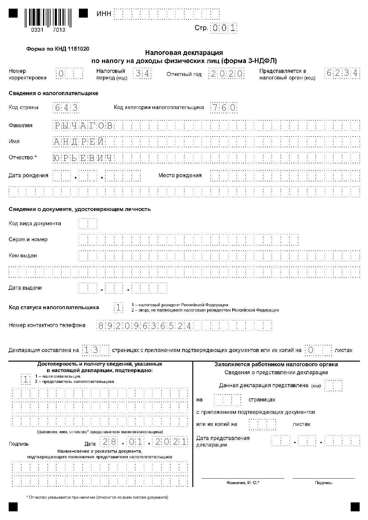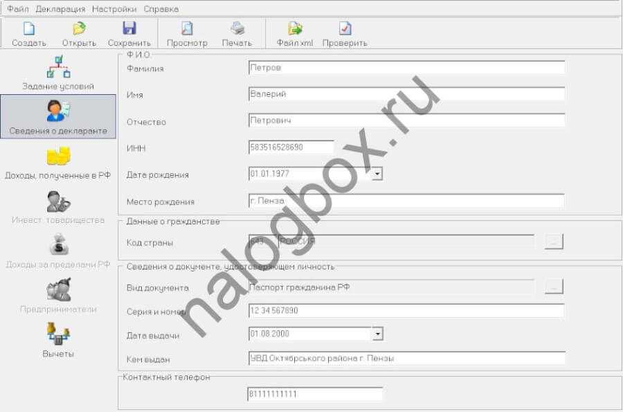 Пример 1. Заполнение налоговой декларации 3-НДФЛ (общий случай)