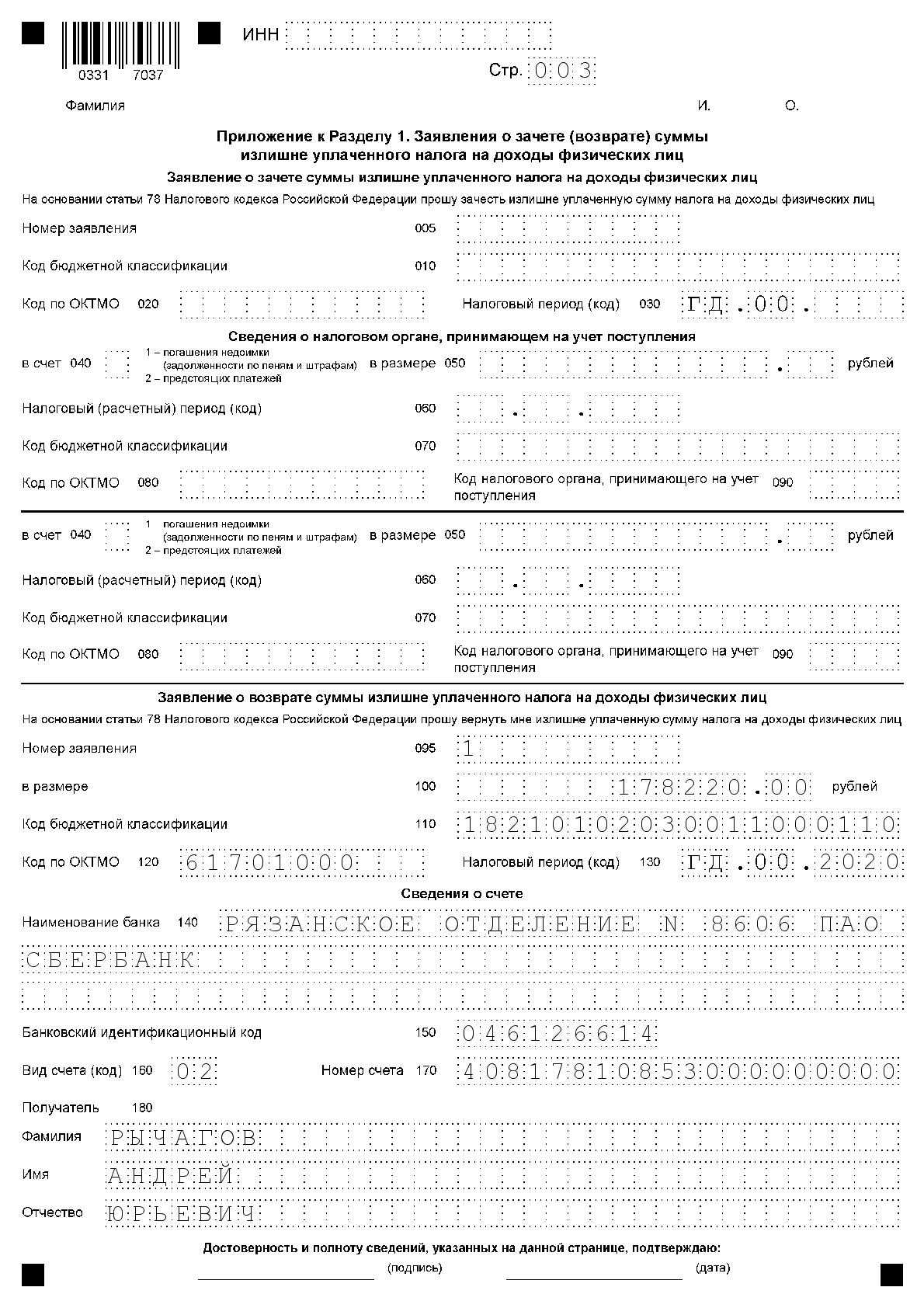 Приложение к Разделу 1. Заявление о зачете (возврате) суммы излишние уплаченного налога на доходы физических лиц