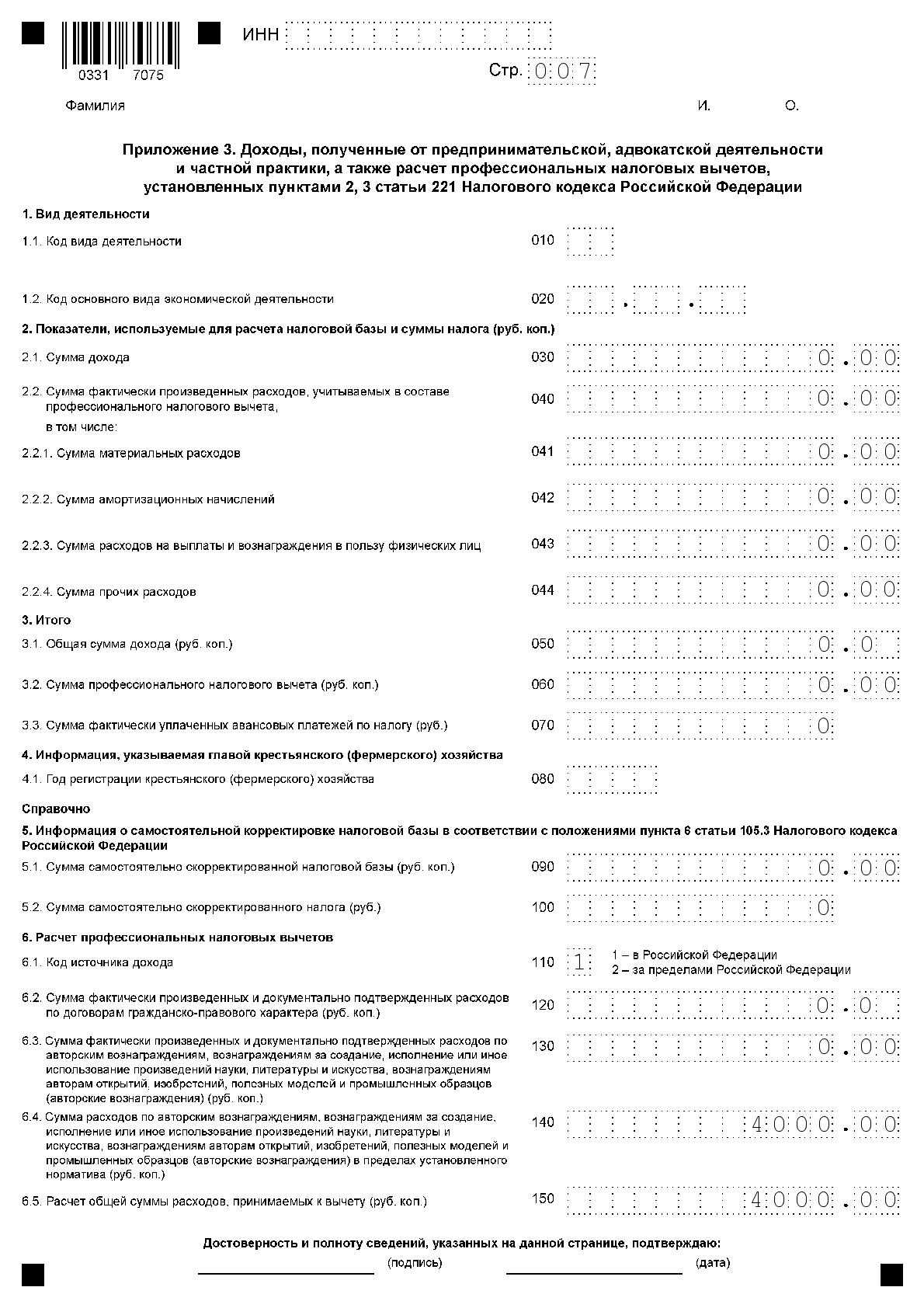 Приложение 3. Доходы, полученные от предпринимательской, адвокатской деятельности и частой практике. а также расчет профессиональных налоговых вычетов, установленных пунктами 2, 3 статьи 221 Налогового кодекса Российской Федерации