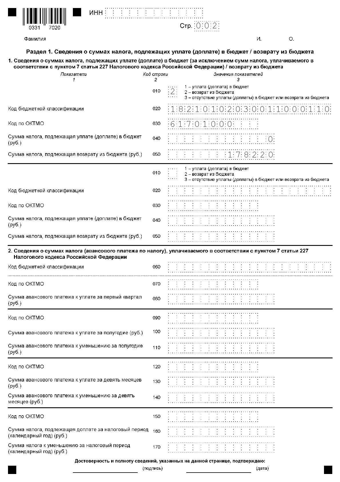 Раздел 1. Сведения о суммах налога, подлежащих уплате (доплате) в бюджет / возврату из бюджета