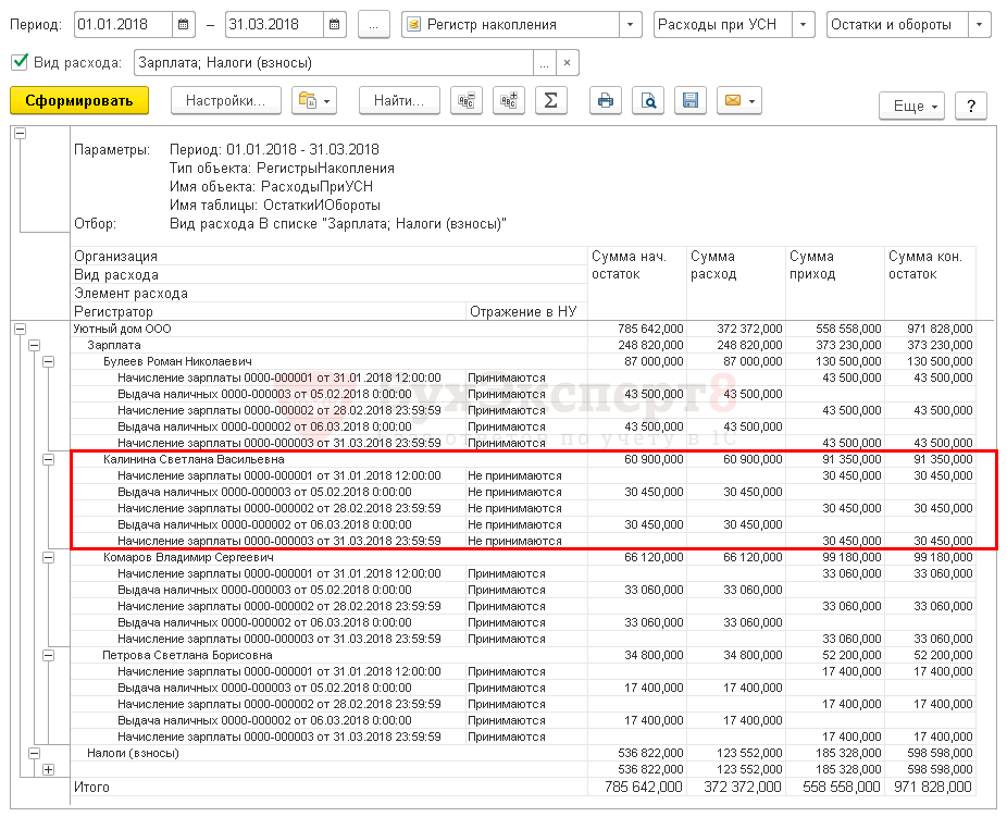 Посмотреть данные регистра накопления «Расходы при УСН» можно через «Универсальный отчет» (находящийся в разделе «Отчеты»), где выбираем регистр и настраиваем группировки и показатели. Данные регистра бухгалтерии формируются в оборотно-сальдовой ведомости. Что бы сделать сверку, необходимо сформировать оба этих регистра за одинаковый период и исследовать данные на наличие расхождений.