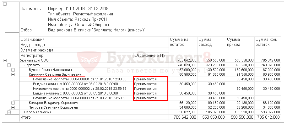 заметите движения по регистру РасходыПриУСН. В этом регистре аккумулируются все расходы, которые должны попасть в КУДиР упрощенной системы налогообложения
