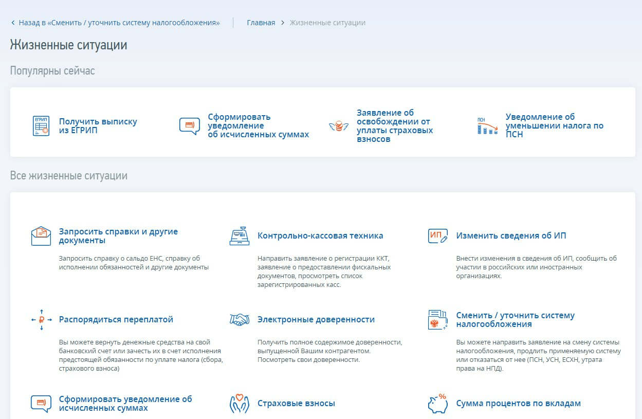 Зайдите в кабинет ИП на сайте налоговой, затем в блок «Жизненные ситуации» и нажмите кнопку «Сменить/уточнить систему налогообложения».