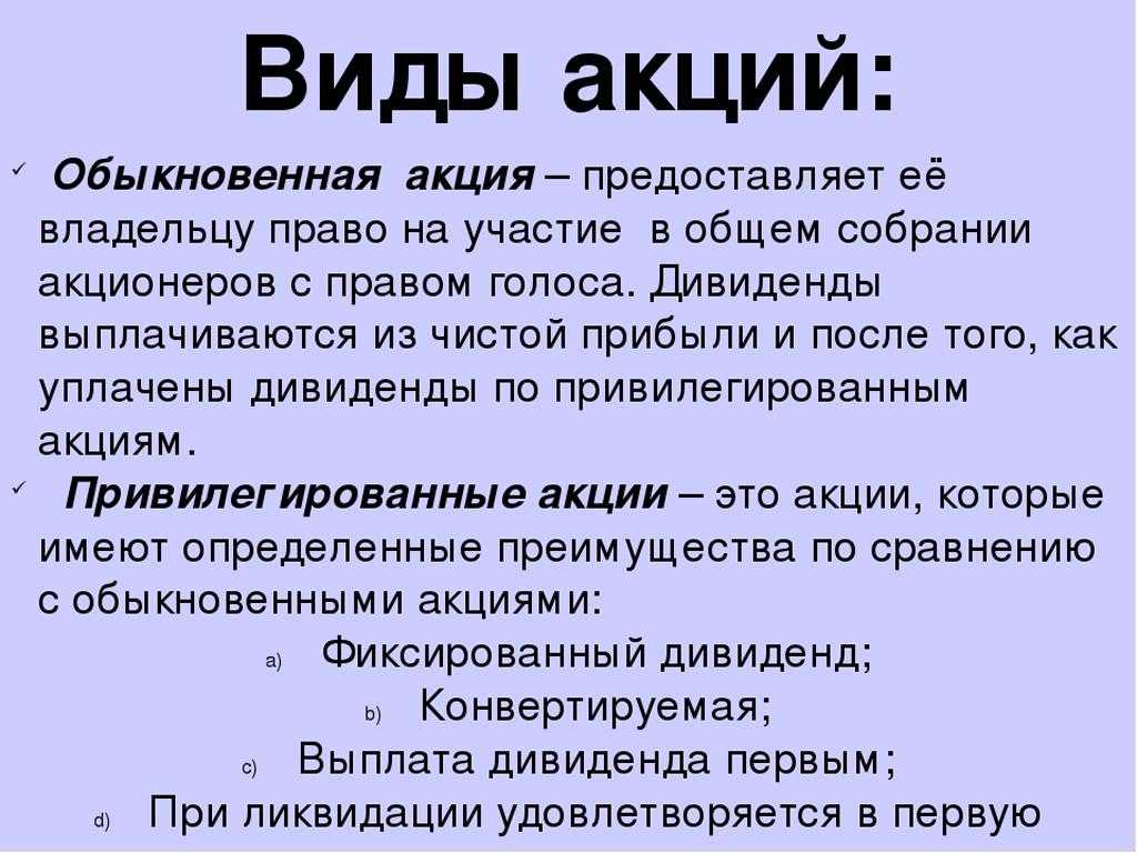 Самым распространенным видом ценных бумаг являются акции. Они выпускаются компаниями и дают долю во владении. Выражается это в том, что обладатель акций получает дивиденды как часть от чистой прибыли компании. Решение о выплате дивидендов, а также об их размере принимает общее собрание акционеров.