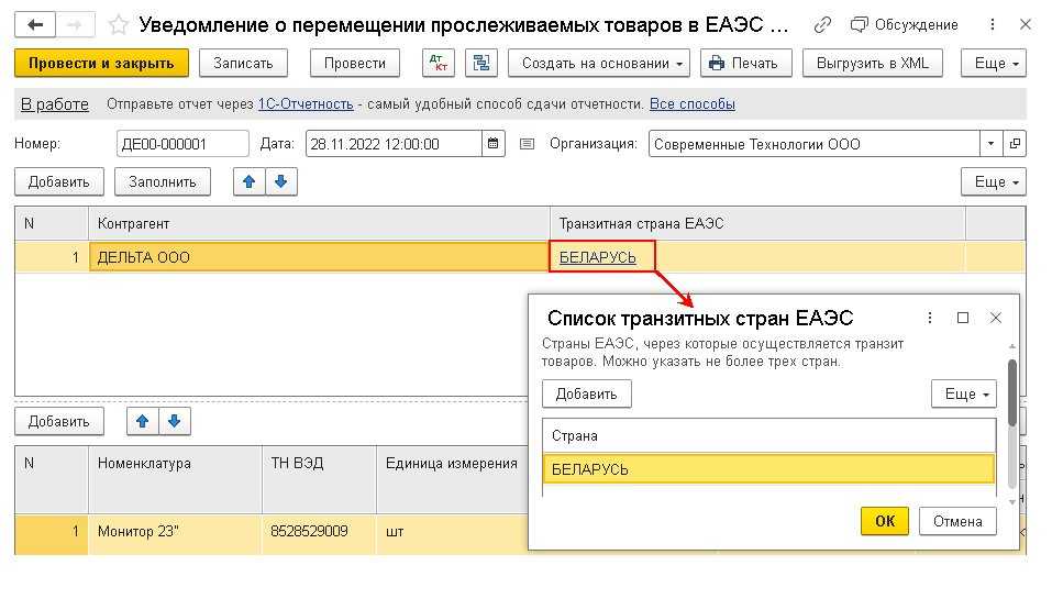 В решениях «1С:Предприятие» экранная форма, формат и заполнение уведомления о перемещении прослеживаемых товаров, ввезенных на таможенную территорию ЕАЭС, поддержаны.