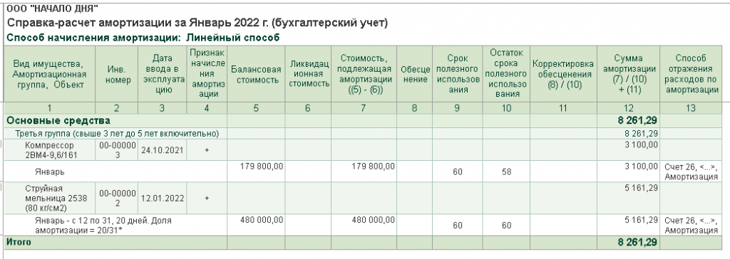 Проанализируем расчет амортизации струйной мельницы за январь 2022 года: