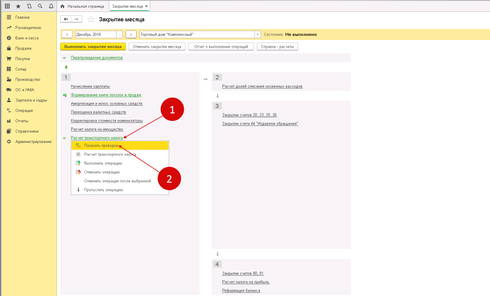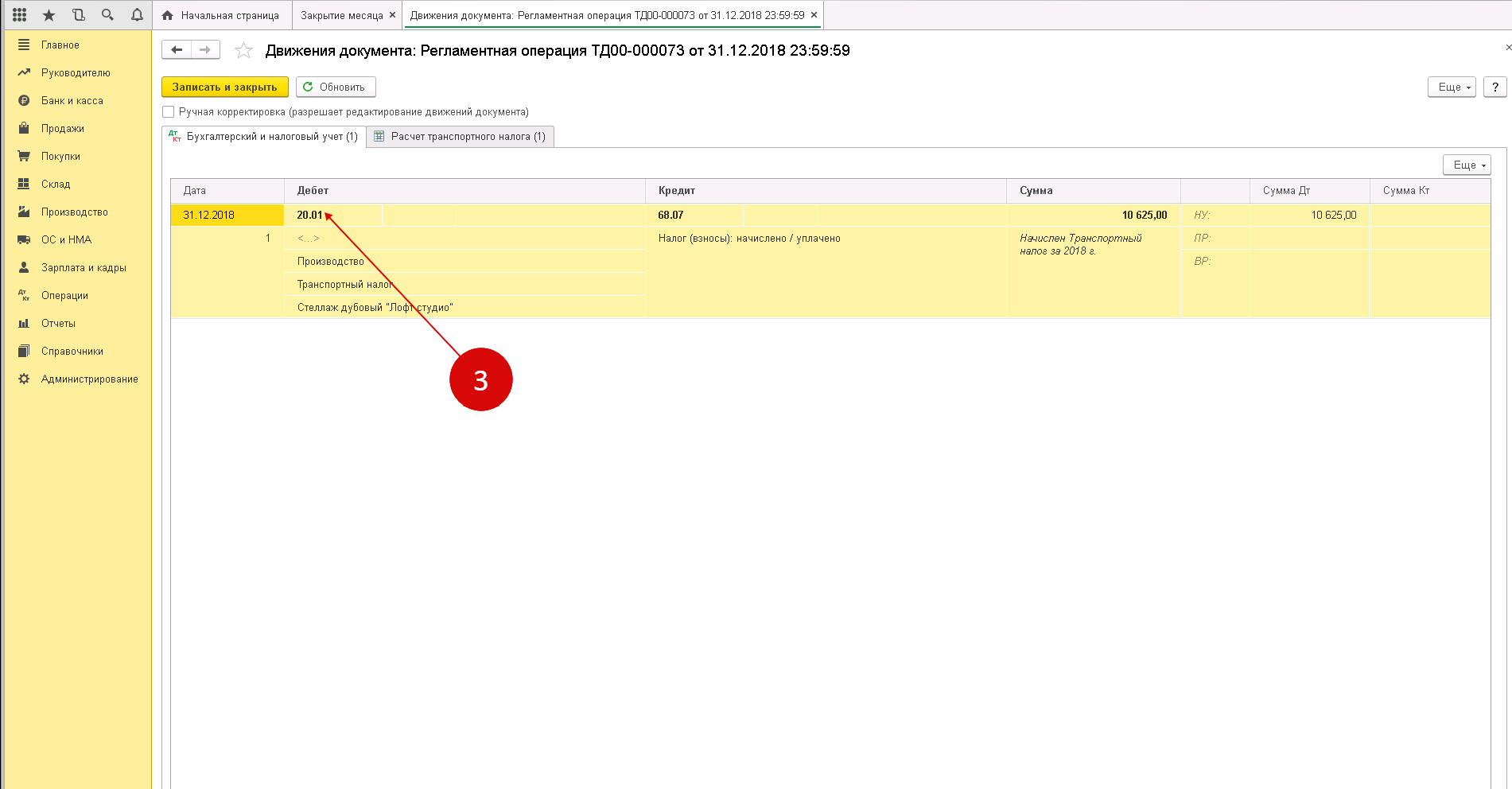 Шаг 5. Проверьте проводки по начисление транспортного налога в 1С 8.3
